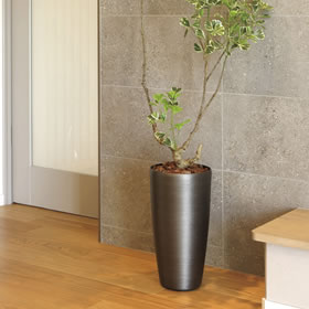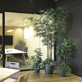 オフィスの邪魔にならないよう、すっきりとしたスリムな樹形でおしゃれなインテリアにマッチするシンプルなモノトーンの鉢を使用しました。